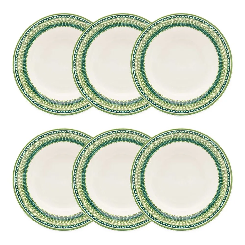 Do campo para a mesa. A coleção Donna Campestre apresenta uma proposta de elementos que caracterizam a vida pacata da área rural onde plantas, folhagens e flores embelezam o dia a dia. A combinação de tonalidades de verde e diferentes formas representam a variedade encontrada na flora brasileira. O conjunto é composto por 6 pratos fundos.